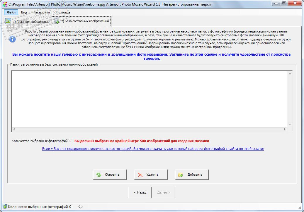 - Добавьте в базу программы папки с фотографиями, которые будут выполнять роль пазлов мозаики (чем больше фрагментов загрузите, тем лучше получится фотомозаика);