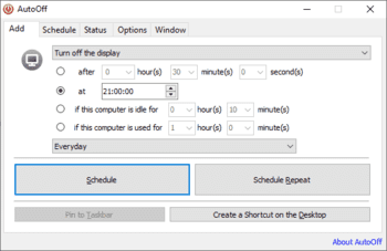 AutoOff - небольшая, но достаточно удобная программа для выключения или перезагрузки компьютера в определенное время. Помимо этого, ПК можно перевести в режим сна, отключить дисплей, заблокировать Windows и выполнить другие действия для экономии батареи и защиты конфиденциальных данных. AutoOff имеет удобный и понятный интерфейс, с помощью которого очень легко управлять питанием компьютера, устанавливая различное расписание планировщика. Кроме того, утилита интегрируется в трей, откуда также доступны выше указанные функции.