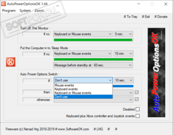 AutoPowerOptionsOK - небольшая бесплатная утилита, которая позволяет управлять параметрами питания ПК, как например настройка выключения монитора, режим сна и переключение между разными планами электропитания в установленные пользователем интервалы времени.