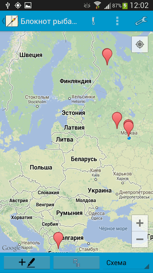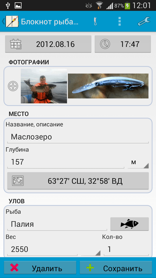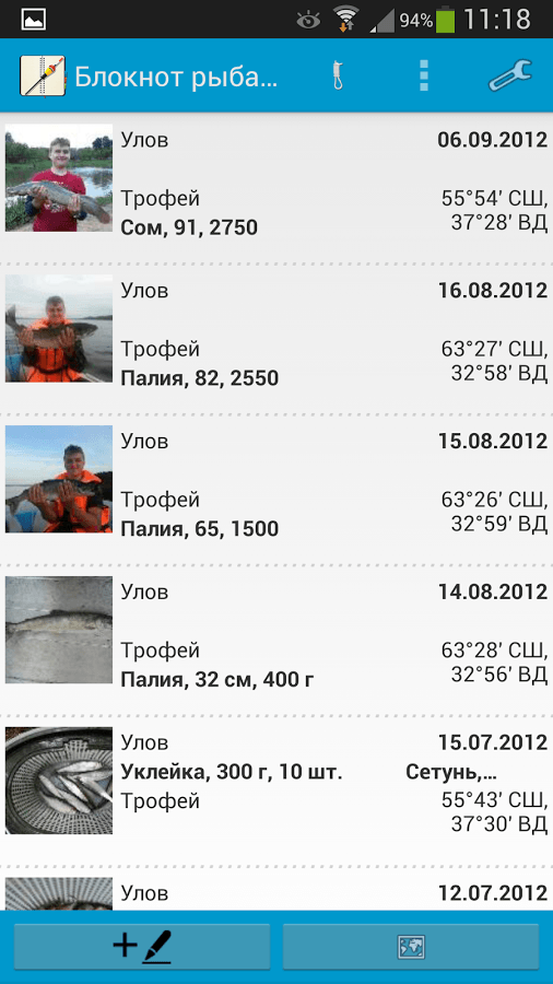 - возможность отметить места лова - по сигналам GPS, по GPS-тегам из фотографий, либо по карте;