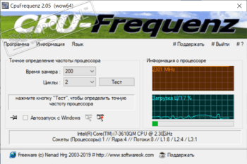 CpuFrequenz - небольшая утилита, с помощью которой можно быстро и легко выяснить частоту работы центрального процессора. Присутствует возможность провести тест для более точного определения частоты ЦП. Программа позволяет выбрать продолжительность проверки в миллисекундах и количество циклов.