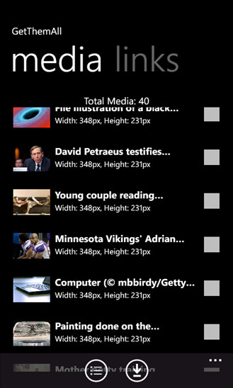 GetThemAll — программа для загрузки из интернета текстовых, аудио-, видео-файлов. Приложение анализирует веб-страницы и определяет ссылки на различные документы и медиа-материалы. Поддерживается загрузка видео (в том числе и HTML5), музыкальных файлов, архивов, фотографий, исполняемых файлов, PDF- и TXT-документов и множество других форматов.