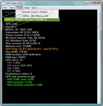 GPU Shark - небольшая бесплатная и портативная (не требует инсталляции) утилита для мониторинга NVIDIA GeForce и ATI Radeon видеокарт. С помощью программы пользователь может узнать такую информацию, как название видеокарты, ее температура, кодовое имя, версия драйвера, идентификатор устройства, тип видеопамяти, загрузка GPU, памяти и многое другое. Присутствует два режима просмотра: упрощенный и подробный.