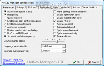 Hot Key Manager - программа позволяющая вешать на горячие клавиши такие функции как выключить\включить\релогин, изменение громкости, управление винампом, использовать 4 виртуальных рабочих стола под Windows NT/2000/XP, сворачивать окна в панель задач и в трей, управлять аттрибутом всегда поверх всех окон, изменять степень прозрачности окон в WIN'2000/XP, блокировать рабочий стол паролем, запускать скринсейвер, управлять лотком CDROM'а, переводить набранный в неверной раскладке текст и др.HotKey Manager 1.70