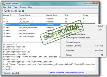 InsideClipboard - небольшая бесплатная утилита, которая отображает бинарное содержимое всех форматов, хранящихся в настоящее время в буфере обмена (буфер обмена Windows отображает только основные форматы буфера обмена, такие как текст и рисунки). С помощью программы можно сохранить содержимое конкретного формата в двоичный файл.