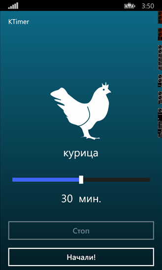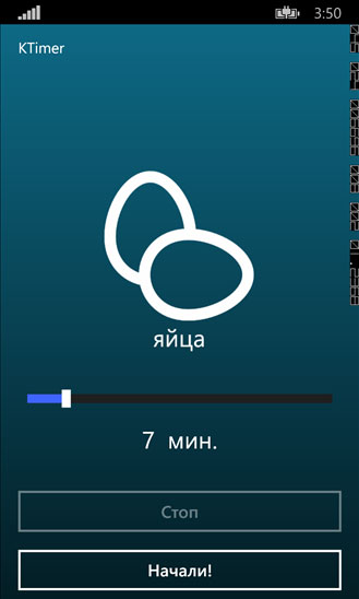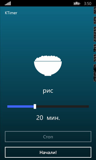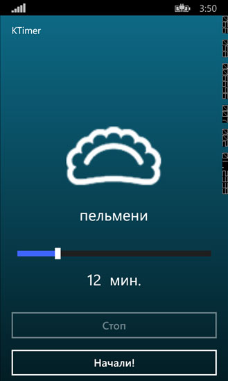 KTimer — кухонный таймер для Windows Phone смартфонов, предназначенный для обратного отсчета времени при приготовлении различных видов блюд. Таймер имеет несколько предустановленных настроек. Например, варка яиц, пельменей, риса. Вы можете самостоятельно выставить необходимое значение таймера обратного отсчета. Единственное ограничение - это время не должно превышать 60 минут.