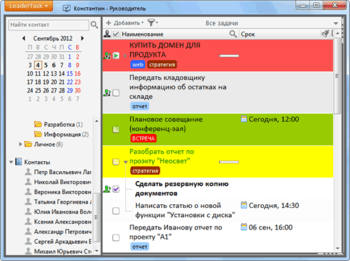 Также стоит отметить, что LeaderTask поддерживает все основные методологии тайм-менеджмента - GTD, Autofocus, Do It Tomorrow и др. В общем, данный органайзер - идеальная находка для любого руководителя, консультанта, предпринимателя да и вообще любого делового человека, которая поможет стать эффективным и успешным менеджером.