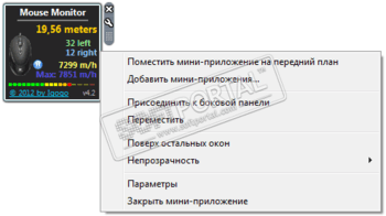 Mouse Monitor - небольшой гаджет для ОС Windows Vista/7, который отображает подробную статистику использования мыши, как например количество кликов левой и правой клавишей, ее "пробег", скорость и т.д.