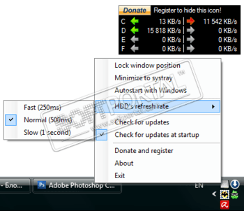 My HDD Speed - небольшая бесплатная утилита, которая находится в системном трее и в режиме реального времени отображает скорость чтения/записи всех жестких дисков. Присутствует возможность автоматической загрузки программы. Утилита не требует инсталляции.