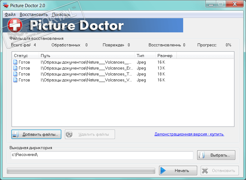 Picture Doctor - программа для восстановления фотографий, картинок и изображений в формате JPEG и PSD. Эта утилита восстанавливает поврежденные файлы и сохраняет их в формате BMP. Для работы с программой какие-либо специфические знания не требуются, достаточно лишь выбрать восстанавливаемые изображения и папку для сохранения, все остальное инструмент сделает самостоятельно.