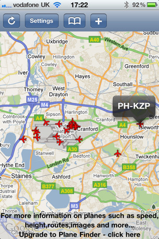 Plane Finder - приложение показывает точное местонахождение на карте страны всех самолетов, которые фиксируются радарами. Программа выдает подробную информацию о выбранном самолете в том числе и фото самолета.