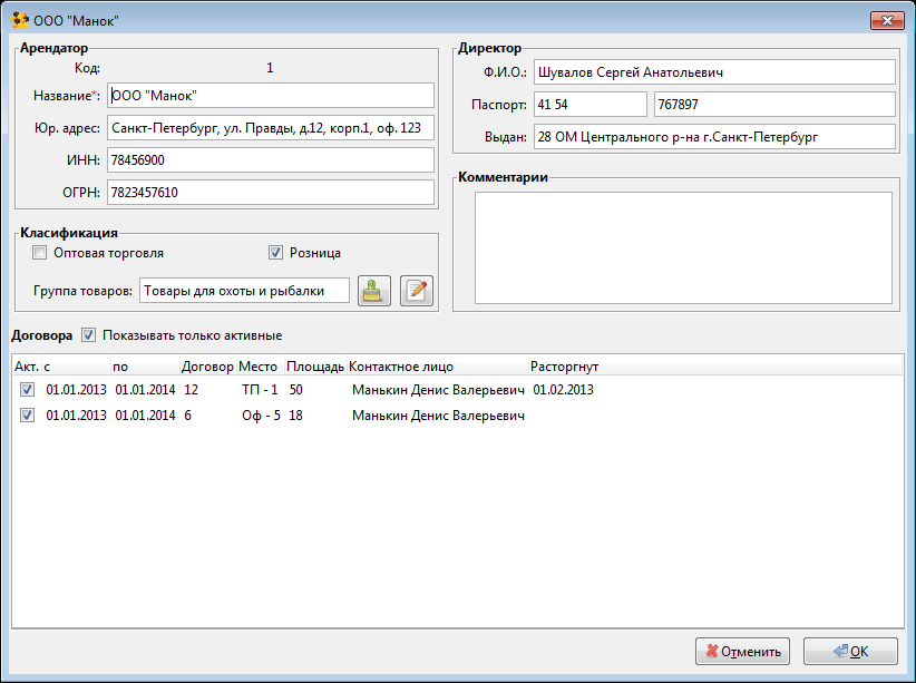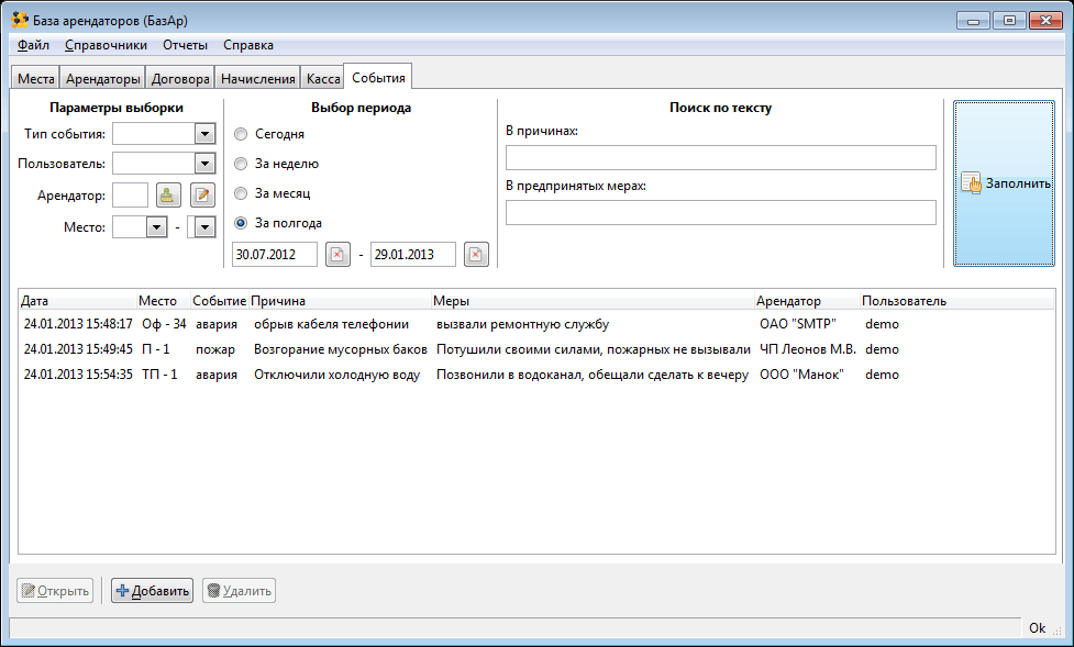 Также программа будет полезна для владельцев торговых и складских площадей не только для их учета(информация об арендаторе, арендуемом месте, классификация), но и для охраны арендуемых площадей (фиксация событий произошедших на объекте, причины предпринятых мер и др.). В единой базе можно вести несколько организаций. Есть возможность отслеживать задолженность и управлять расходами, производить массовые ежемесячные начисления и контролировать своевременность оплаты, создавать отчеты по доходам и расходам и т.д.