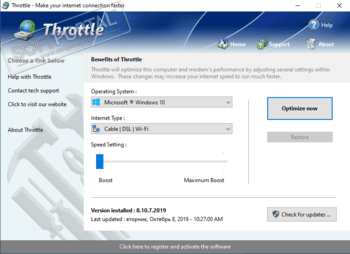 Throttle - утилита предназначена для настройки сетевых параметров вашего ПК на максимальное быстродействие, что в результате может привести к более, чем 200-процентному увеличению скорости работы Интернета. Вы просто выбираете свою OS, тип соединения (кабельный модем, DSL/ADSL модем, ISDN, Satellite, T1/T3/OC3/OC12+, локальная сеть или мобильный LTE/4G/3G/2G/Edge модем) и нажимаете кнопку "Оптимизировать". Остальное программа сделает сама!