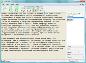 TTSReader - бесплатная программа для преобразования текста в речь. Поможет прочесть в слух любой текст, а так же сохранить его в WAV или MP3 файл.В TTSReader уже имеются порядка 10 мужских и женских голосов. При этом вы в любой момент можете