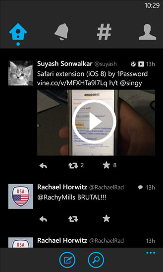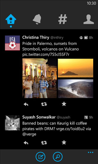 Twitter — официальный Windows Phone клиент популярнейшего сервиса микроблогов. С его помощью вы сможете читать твиты, публиковать свои сообщения, искать пользователей и сообщения, делиться фотографиями.