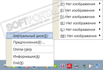 После установки эмулятор удобно размещается в трее, где кликнув по иконке будет доступен список созданных приводов, на каждый из которых можно монтировать отдельный образ.