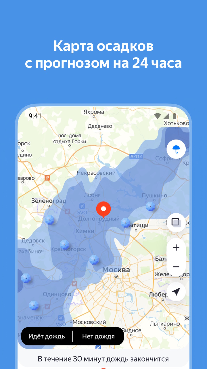 Яндекс.Погода - приложение для Android-смартфонов и планшетов, с помощью которого можно в любое время узнать подробный прогноз погоды (температуру воздуха, скорость ветра, давление и влажность) как на текущий момент, так и на следующие девять дней.